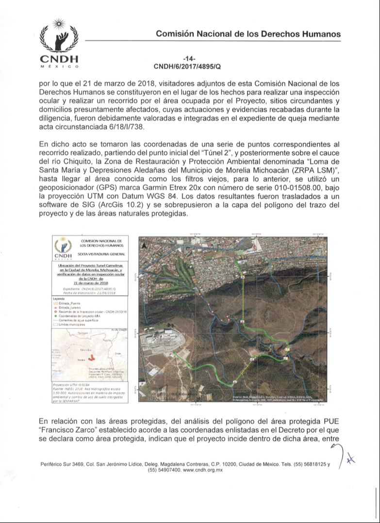 La CNDH en la página 14 del oficio mencionado, dice: “El 21 de marzo de 2018, visitadores adjuntos de esta CNDH… tomaron las coordenadas de una serie de puntos correspondientes al recorrido realizado, partiendo del punto inicial del “Túnel 2”. En relación con las áreas protegidas, del análisis del polígono del ANP “Francisco Zarco” estableciendo acorde a las coordenadas enlistadas en el Decreto por el que se declara como ANP, indican que el proyecto incide dentro de dicha área, entre los cadenamientos 4+202 y 4+216, previo a la salida del “Túnel 2”.