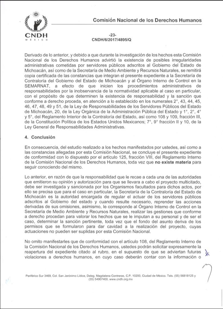 En sus conclusiones la CNDH afirma: “Derivado de lo anterior, y debido a que durante la investigación de los hechos esta Comisión Nacional de los Derechos Humanos advirtió la existencia de posibles irregularidades administrativas cometidas por servidores públicos adscritos al Gobierno del Estado de Michoacán, así como de la Secretaría de Medio Ambiente y Recursos Naturales, se remitirá copia certificada de las constancias que integran el presente expediente a la Secretaría de Contraloría del Gobierno del Estado de Michoacán y al Órgano Interno de Control en la SEMARNAT, a efecto de que Inicien los procedimientos administrativos de responsabilidades por la inobservancia de la normatividad aplicable”. .