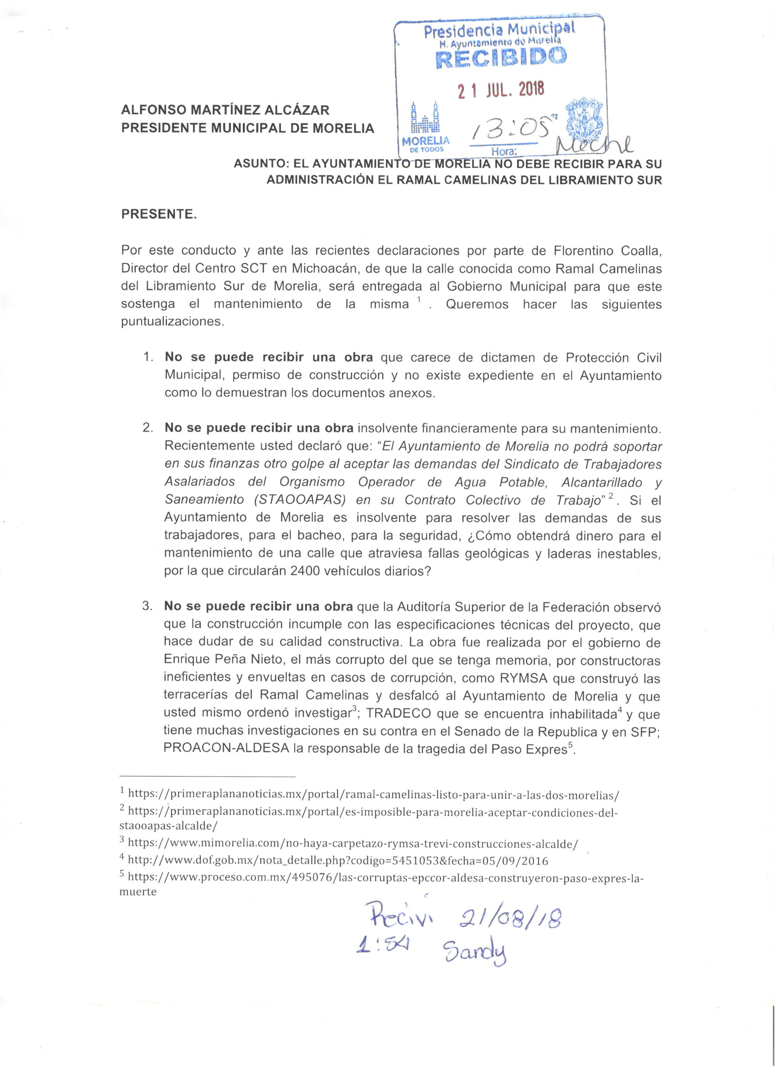 Por este conducto y ante las recientes declaraciones por parte de Florentino Coalla, Director del Centro SCT en Michoacán, de que la calle conocida como Ramal Camelinas del Libramiento Sur de Morelia, será entregada al Gobierno Municipal para que este sostenga el mantenimiento de la misma[1]. Queremos hacer las siguientes puntualizaciones.