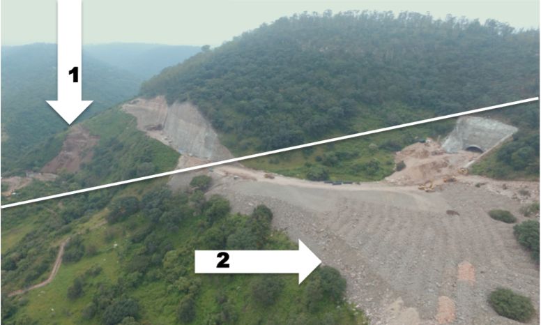 1.- Deslave y 2. Manejo inapropiado de los desechos del túnel 1. Línea blanca: Falla Geológica Altozano