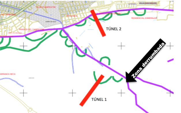 Las imágenes aéreas también nos muestran que la SCT está incumpliendo lo establecido en la Manifestación de Impacto Ambiental, en la cual se establece que: “Durante la construcción de obras cercanas a los escurrimientos superficiales se deberá vigilar constantemente que no existan caídos de materiales hacia los cauces para evitar contaminación… No deberán arrojarse materiales y/o residuos de construcción a los cuerpos de aguas”. Ambas resoluciones están vulneradas, puesto que en la imagen se observan que se está sepultando los arboles con desechos del túnel 1 y afectando gravemente la cañada del rio Chiquito.
