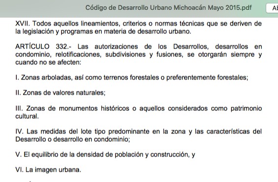 2. No cumple con lo que establece el Artículo 332 del Código de Desarrollo Urbano del Estado de Michoacán de Ocampo, que establece: Las autorizaciones de los Desarrollos, desarrollos en condominio, relotificaciones, subdivisiones y fusiones, se otorgarán siempre y cuando no se afecten: I. Zonas arboladas, así como terrenos forestales o preferentemente forestales; II. Zonas de valores naturales; III. Zonas de monumentos históricos o aquellos considerados como patrimonio cultural y VI. La imagen urbana.