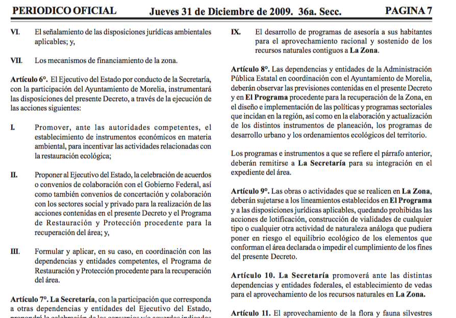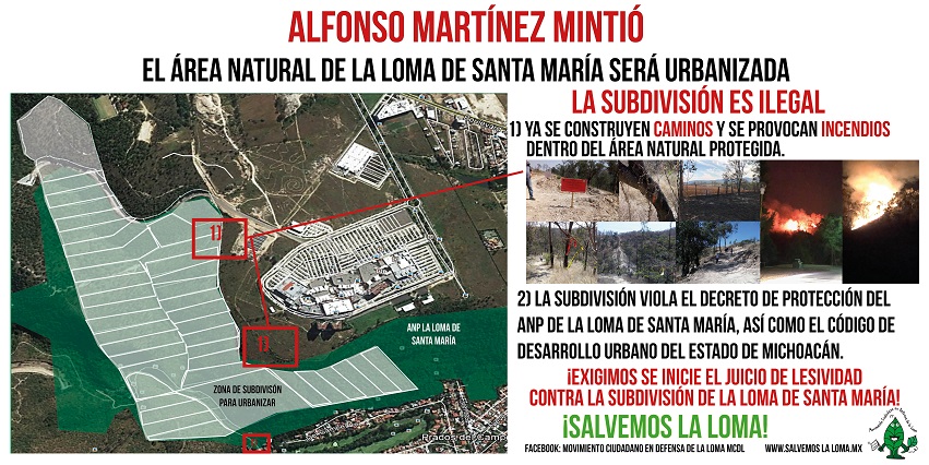 1. Viola el decreto de Área Natural Protegida de la Loma de Santa María y de presiones Aledañas del Municipio de Morelia, el cual, en su Artículo 9°,establece: Las obras o actividades que se realicen en La Zona, deberán sujetarse a los lineamientos establecidos en El Programa y a las disposiciones jurídicas aplicables, quedando prohibidas las acciones de lotificación, construcción de vialidades de cualquier tipo o cualquier otra actividad de naturaleza análoga que pudiera poner en riesgo el equilibrio ecológico de los elementos que conforman el área declarada o impedir el cumplimiento de los fines del presente Decreto.