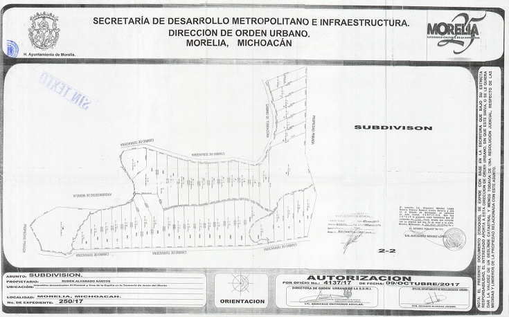 De acuerdo al documento con número de registro 00000038 en el tomo 00014196 del Registro Público de la Propiedad y de Comercio de Michoacán, se puede corroborar el plano anexo autorizado por el H. Ayuntamiento con número de oficio 4137/17 de fecha09/octubre/2017. Con la cual el Ayuntamiento autoriza la subdivisión de la Loma de Santa María.